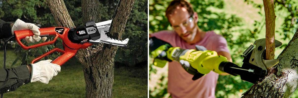Сучкорез приводится в действие вручную или с помощью механизма, работающего от бензина либо от электричества.