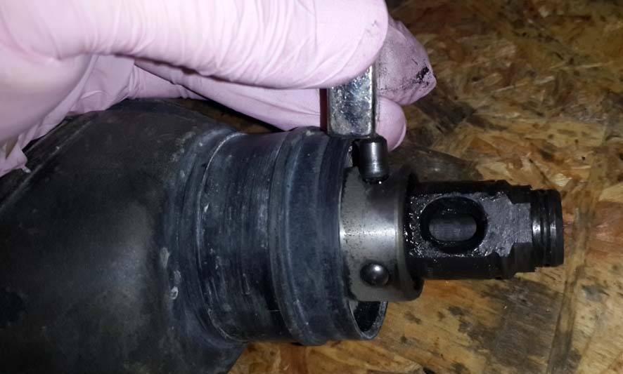 Ремонт патрона перфоратора производится для замены пыльника и резинового кольца, а также конической пружины и стального шарика, обеспечивающего зажим рабочего инструмента (бура). На это указывает то, что рабочий инструмент? а именно бур, плохо удерживается в патроне.