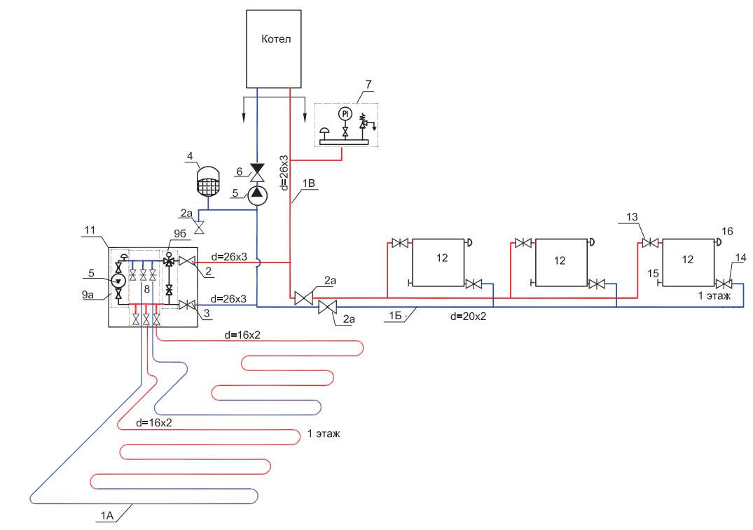 - нагревательного котла, который обычно устанавливается в подсобном помещении (котельной);
