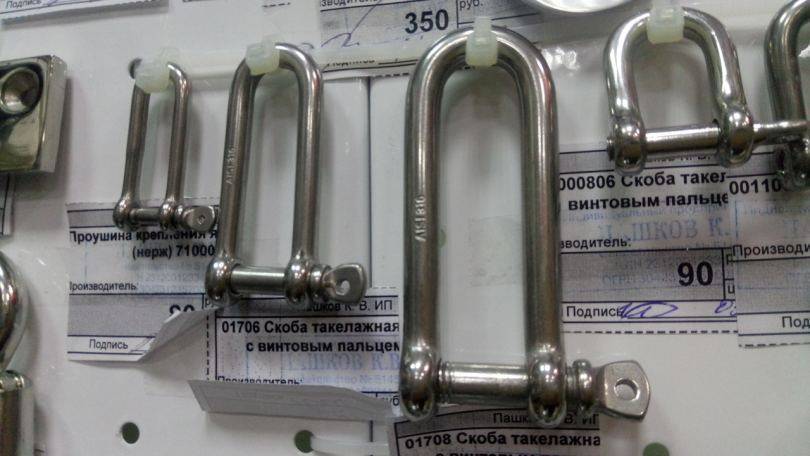Скобы ОСТ 5.2312-79 СБ, изготовленные из профиля круглого сечения с расположенными на концах отверстиями для пальцевых элементов применяются для крепления цепей, тросов и прочих такелажных компонентов;