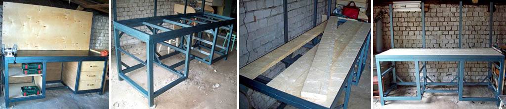 Как видите, верстаки сильно отличаются по конструкции, и материалы могут быть самые разные. Обычно это то, что есть в гараже, но они могут быть и покупными.