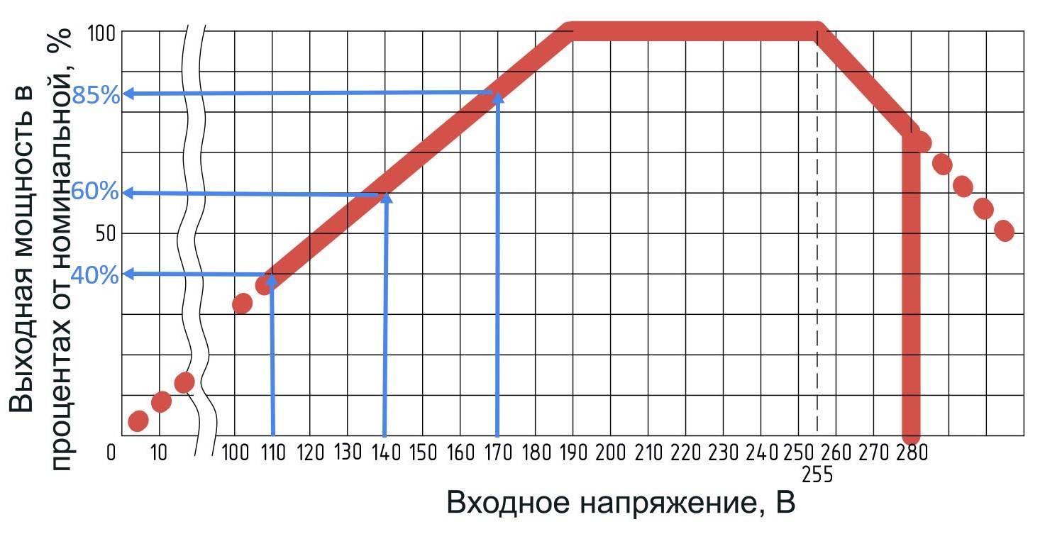 Как видим с графика выше, при падении напряжения до 170В, стабилизатор сможет выдать максимум 85% от своей мощности. Если брать для примера, аппарат на 10 кВт, то получаем:
