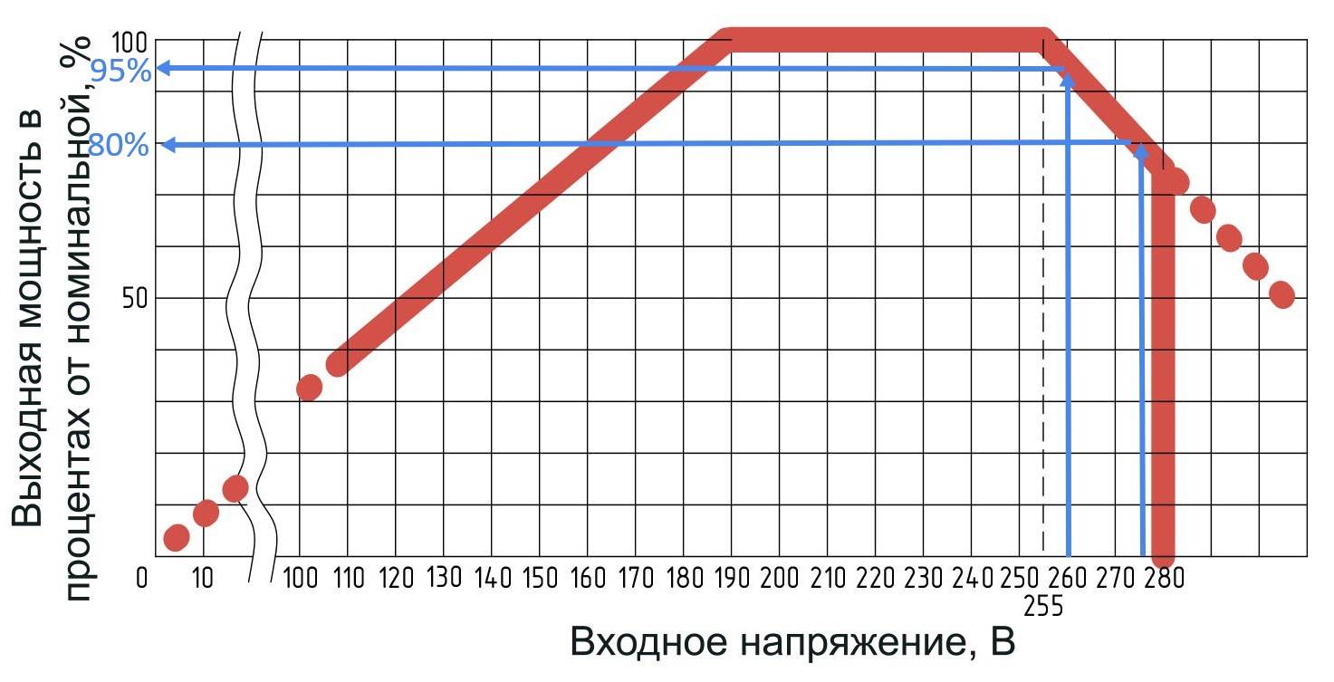 Уже при 255В стабилизатор начинает терять в мощности, а при 275В способен выдать только 80% от заявленных значений. При 280В идет защитное отключение.