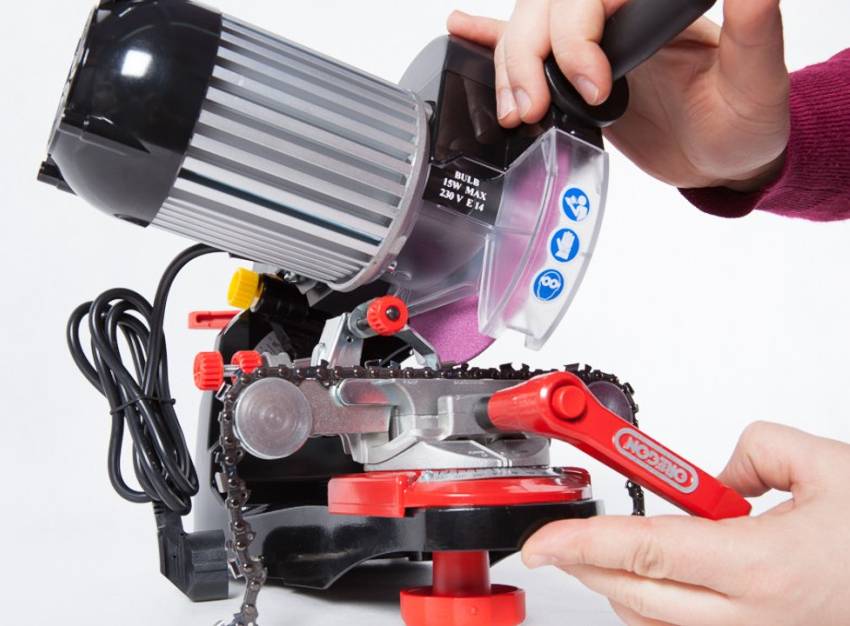 Станок для заточки цепей «Орeгон» комплектуется 3 шлифовальными кругами разного диаметра. Для работы в малоосвещенном месте на устройстве установлена подсветка в виде лампочки на 15 Вт. Инструмент может развивать мощность до 214 Вт, обеспечивая частоту вращения шпинделя 6000 об/мин. Станок способен заточить цепь любого вида с разным шагом звеньев. Стоимость инструмента составляет 32,2 тыс. руб.
