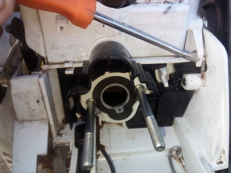 Разобрав бензопилу Stihl MS 180, можно увидеть сальники, после этого необходимо наполнить картер бензином и проконтролировать протечку. Наполнить картер, можно через топливное окно в цилиндре, для этого поршень необходимо поднять максимально вверх.