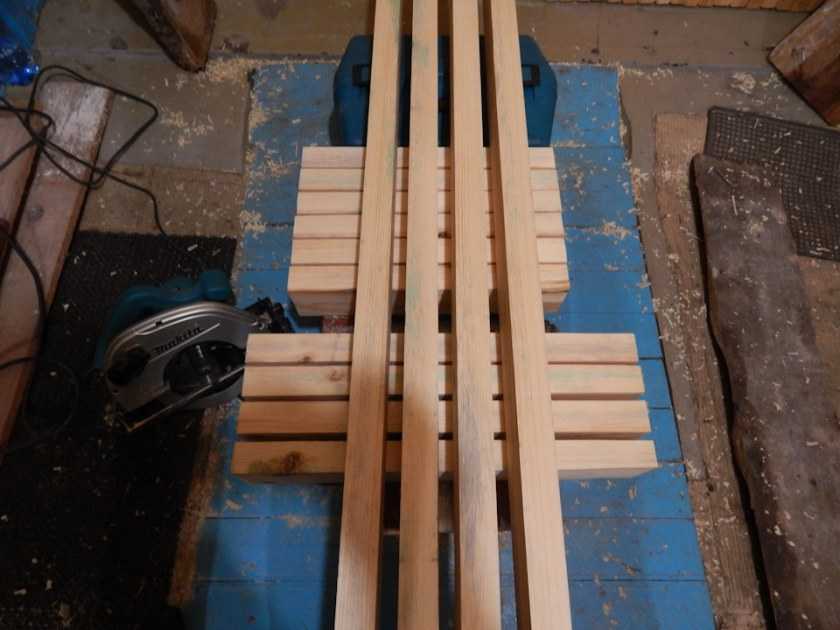 - Заготовки укладываются лицевой стороной вниз (на ровном основании) и скрепляются брусками. Они помещаются перпендикулярно осевым линиям досок, а толщина последних позволяет притянуть их толстыми саморезами. В крайнем случае, в отдельных точках несложно высверлить углубленные фаски.