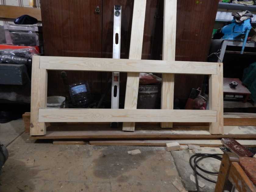- Под «треугольниками», вплотную к ним или на небольшом расстоянии закрепите нижние перекладины – т. н. подверстачье. Если столешница окажется на высоте, к примеру, 105 см, то высота полки для ящиков – 75 см. Периметр подверстачья равен периметру верхней рамы. Усильте его в центре при помощи вертикальных перекладин, соединяющих горизонтальные (царги) с доской верхней рамы. В плоскости, совпадающей с вертикальными перекладинами, установите и закрепите косоугольные проставки.