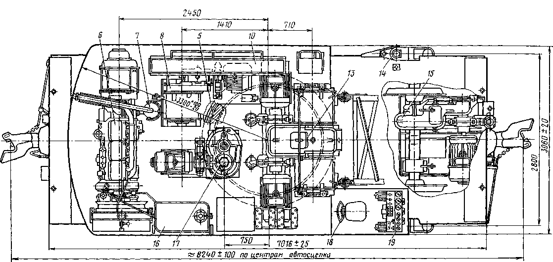 / — вал грузовых барабанов; 2 — главный вал; 3 — вертикальный вал привода колесных пар; 4- горизонтальный вал механизма подье-•ма стрелы; 5 — горизонтальный вал поворота; 6 — вертикальный вал механизма подъема стрелы; 7 — главный вентиль; 8 — регулятор пара; 9 — ось стрелового барабана; 10 — барабан подъема стрелы; //- внлка; 12 — траверса; 13 — грузовые барабаны; 14- указатель грузоподъемности; 15-верхнее опорное кольцо; 16 — опорные катки; 17- нижнее опорное кольцо; 18-гайка центрального шкворня; 19 — центральный шкворень; 20 — вертикальный вал поворота; 21 — горизонтальный вал привода колесных пар; 22 — кулачковая муфта; 23 — ручной привод тормоза тележкн; 24 — фрикционы поворота; 25 — тормоз поворота; 26 — фрикционы груза; 27 — тормоза груза; 28 — фрикционы привода колесных пар; 29 — тормоз привода колесных пар; 30 — привод воздушного тормоза тележки; 31 — аутригер; I — червяк; И — шестерня механизма подъема стрелы; III — венец поворота; IV — цилиндрическая шестерня вертикального вала поворота; V — цилиндрическая шестерня горизонтального вала привода колесных пар; VI — нижняя коническая шестерня вертикального вала привода колесных пар; VII — коническая шестерня горизонтального вала привода колесных пар; VIII — цилиндрическая разъемная шестерня; IX — цилиндрическая шестерня вала грузовых барабанов; X — цилиндрическая шестерня главного вала; XI — промежуточная шестерня; XII -левая цилиндрическая шестерня горизонтального вала механизма подъема стрелы; XIII — коническая шестерня горизонтального вала механизма подъема стрелы; XIV — коническая шестерня горизонтального вала поворота; XV — коническая шестерня горизонтального вала поворота; XVII — правая цилиндрическая шестерня горизонтального вала механизма подъема стрелы; XVIII —