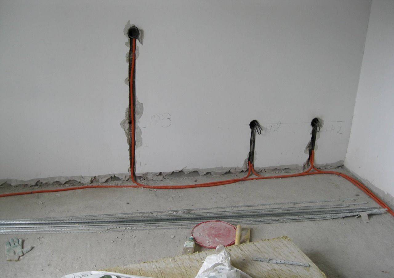 - В напольной плите перекрытия делать штробы запрещено. Если надо провести проводку по полу, то лучшим решением будет сделать ее в бетонной стяжке. Ее нужно залить с расчетом на канавки для проводов.