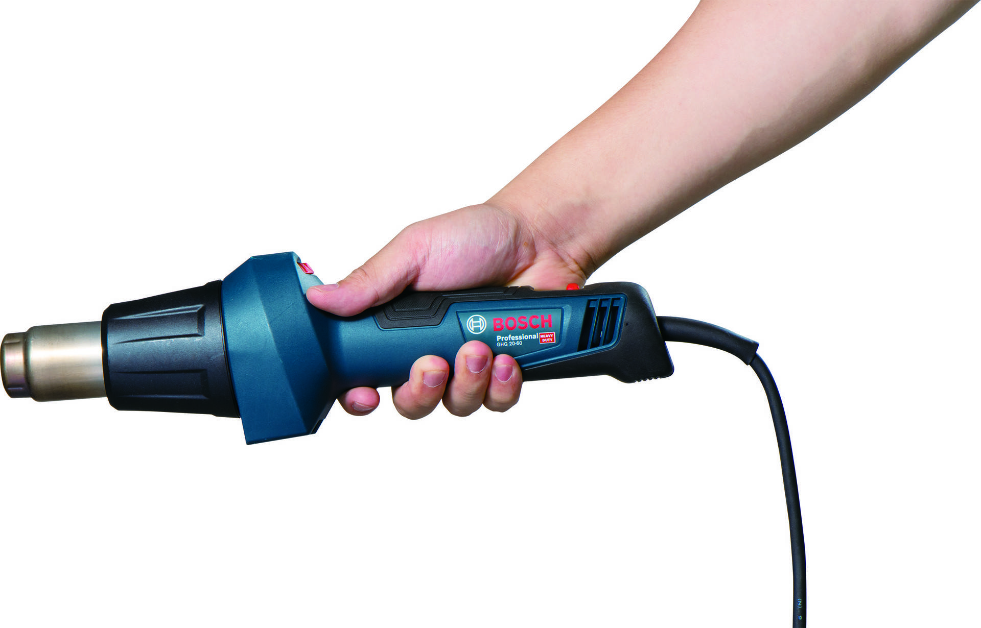 - Bosch GHG. Самый удобный фен в использовании. Мощность инструмента 2,3 кВт, есть 4 режима работы, а также ЖК-экран. Масса до 1 кг, максимальная температура 660 градусов и поток воздуха до 500 л/мин. Комплектуется 2 насадками, есть кейс для хранения. Не рекомендуется пользоваться длительное время без перерыва, это можно назвать единственным недостатком. В дополнение инструмент оснащен воздушным фильтром,
