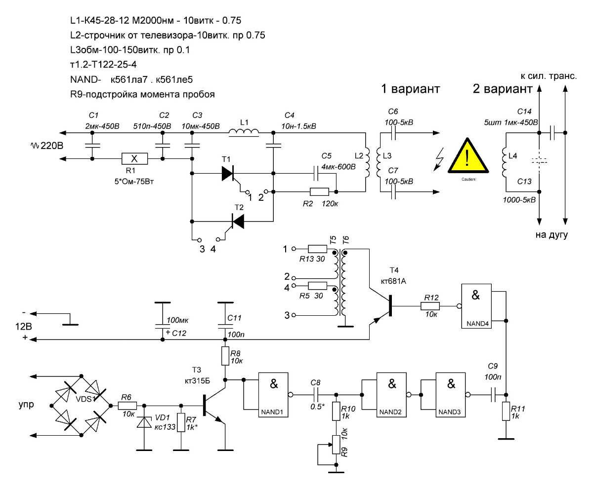 Вторая схема самодельного осциллятора для сварки так же достаточно проста и лишена недостатков предыдущей. Собрать по ней устройство можно с минимальными навыками в монтаже электросхем.
