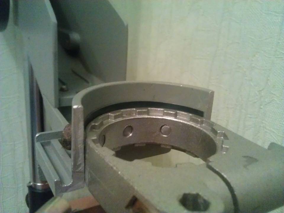 Круг выпиливают лобзиком. Идеальную гладкость гнезду придают круглым напильником. Готовую колодку фиксируют к каретке. Спереди делают пропил и ставят винтовой зажим.