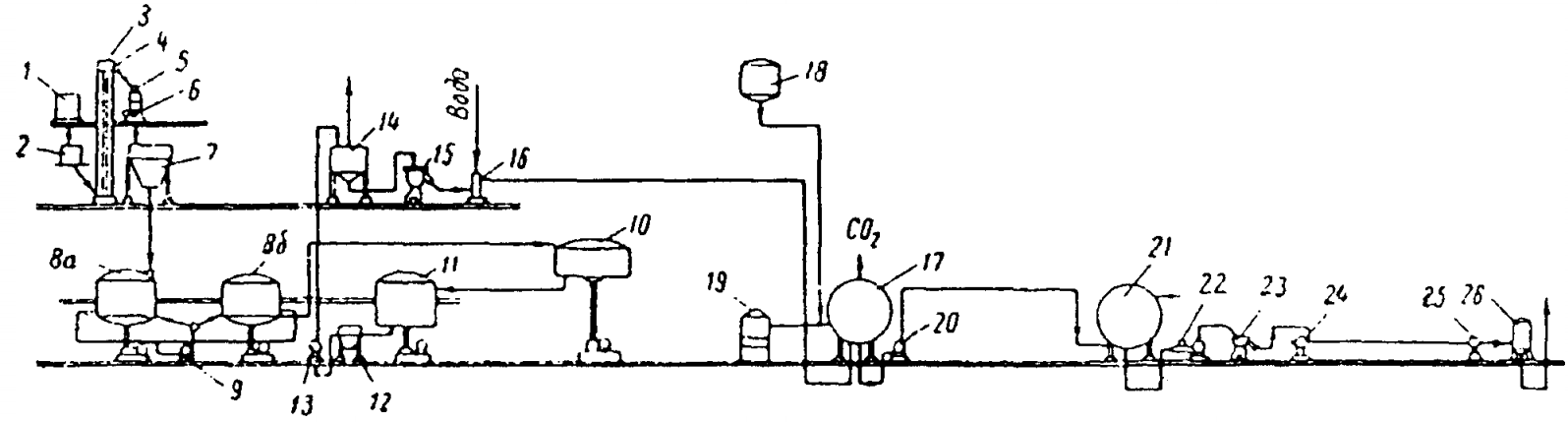 1 – бункер солода; 2 – полировочная машина; 3 – нория; 4 – магнитный аппарат; 5 – весы автоматические; 6 – дробилка; 7 – бункер дробленного солода; 8а и 8б – заторные котлы; 9 – насос отварки; 10 – фильтрационный чан; 11 – сусловарочный котел; 12 – хмелеотделитель; 1 3 -насос; 1 4 -сборник; 15 – сепаратор сусла; 16 – теплообменник; 17 – бродильные чаны; 18 – аппарат чистой культуры дрожжей; 19 – сборник дрожжей; 20 – насос зеленого пива; 21 – лагерные танки; 22 – насос готового пива; 23 – сепаратор; 24 – фильтр-пресс; 25 — охладитель; 26 – сборник фильтрованного пива.Рисунок 6 – Аппаратурно-технологическая схема производства пива