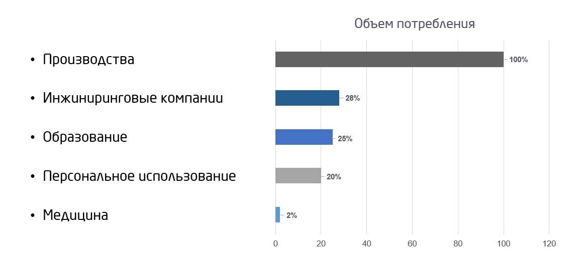 Чуть больше четверти объема от производства – это инжиниринговые компании, которые занимаются 3D-печатью прототипов для проверки на собираемость, наглядных моделей и тому подобного.