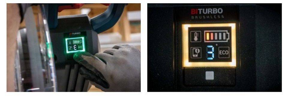 На маленьком дисплее вы найдёте большой объём информации. Рядом с индикатором выбора скорости есть индикатор температуры, индикатор уведомлений и 5-полосный индикатор уровня заряда батареи. Также светится рамка. Её зеленый цвет означает, что все работает нормально, желтый, что температура критическая или аккумулятор почти разряжен, красный – что инструмент перегрелся или аккумулятор полностью разряжен.