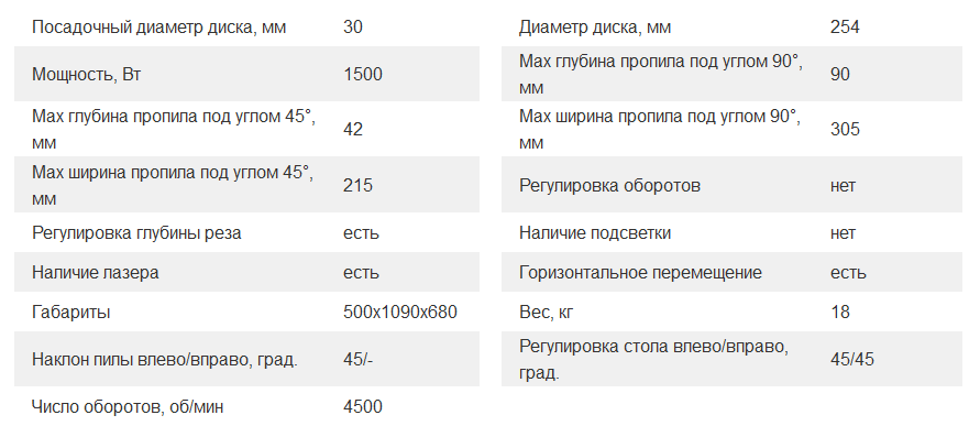 Одни из самых важных параметров пилы — это диаметр диска и параметры реза. В домашней мастерской будет совершенно достаточно диска в 250 мм с посадочным диаметром в 30 мм. Профессиональные системы комплектуются дисками большего диаметра, доходящими до полуметра.