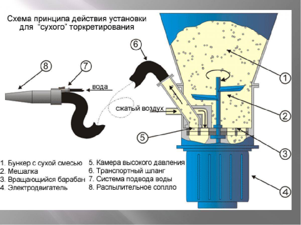 Сухое нанесение бетона, кардинально отличается от мокрого, соответственно для реализации каждого метода используется разное оборудование.