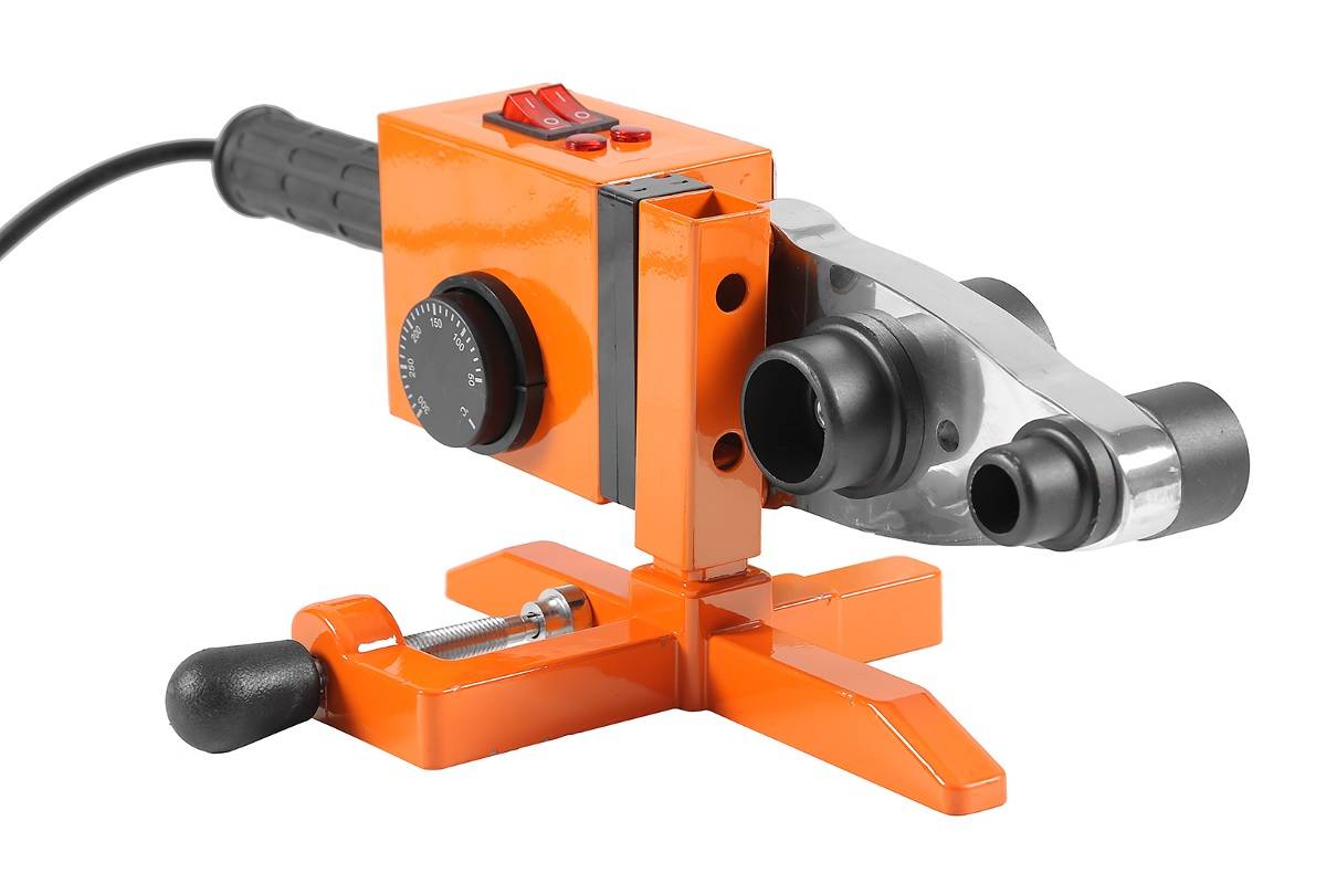 Паяльник для стыковой сварки полипропилена без муфт имеет мощность 800 Вт и поставляется в металлическом кейсе. Нагрев торцов изделий из полипропилена осуществляется при помощи плоской круглой вставки, покрытой антиприлипающим слоем ПТФЭ. На рукоятке есть индикатор сети, контроллер нагрева и диод, показывающий срабатывание защиты от перегрева. Рабочая плата проверена по стандарту VDE и отличается длительным ресурсом.