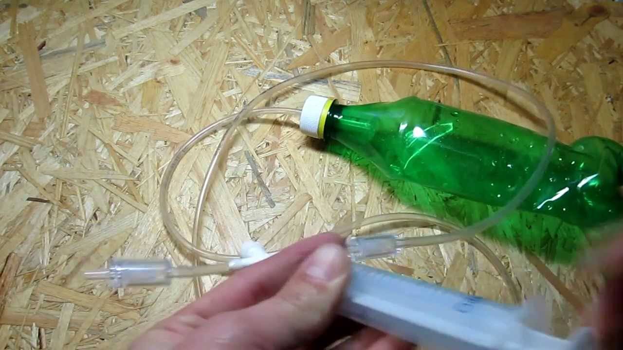 Видео покажет, как сделать насос из двух пластиковых бутылок и куска трубки: