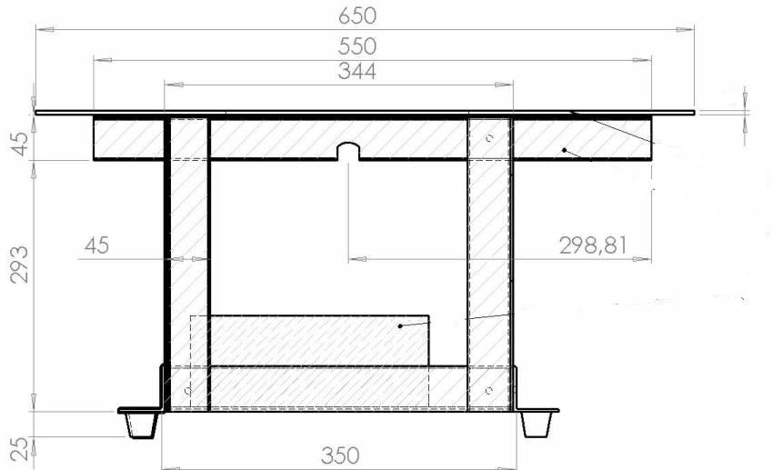 Из листового металла вырезаем две ножки для вала размером 25х6 см и привариваем их по краям корпуса из трубы. Места сварки зачищаем.