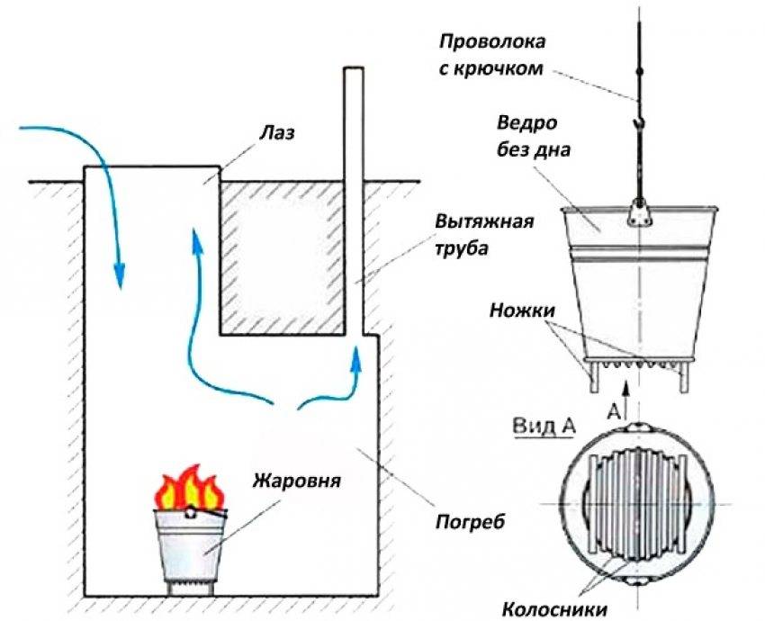 - При помощи железной печки или жаровни – в подвал опускается жаровня или ведро с углями, огонь поддерживается до тех пор, пока в помещении не станет достаточно сухо. Перед началом такой сушки в погребе необходимо открыть дверь и другие отверстия. Огонь лучше всего разжигать при помощи древесных опилок или щепок, а при необходимости операцию можно повторить несколько раз.