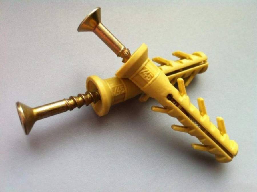 Крепеж типа дюбель-бабочка считается оптимальным вариантом для закрепления конструкций с небольшой массой, элементов декораций на гипсокартон, различных фанерных панелей.