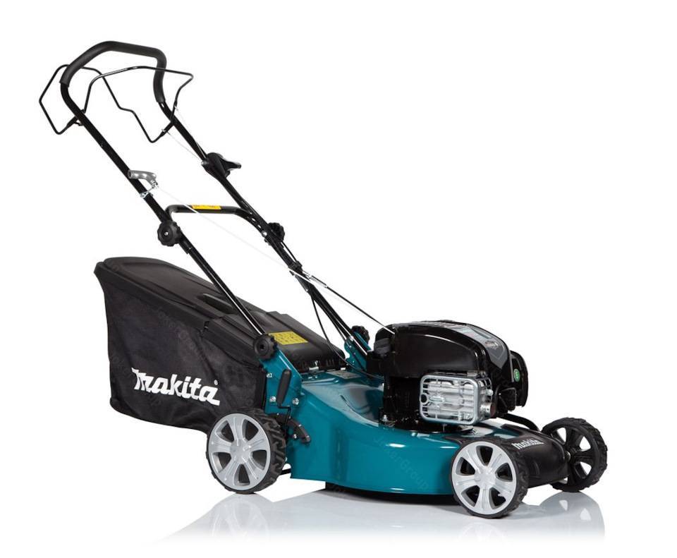На второй строчке находится Makita PLM5120N2. Данная модель подойдет для участка площадью 15 соток, она весит чуть больше 25 кг и отличается привлекательным дизайном. Производитель оснастил устройство двигателем мощностью 2.90 л. с. Регулировка оборотов осуществляется автоматически, что приводит к автоматическому увеличению его производительности при повышении нагрузки. Топливный бак рассчитан на объем 0.8 л. Газонокосилка отличается небольшим уровнем шума и легким запуском пускового троса.