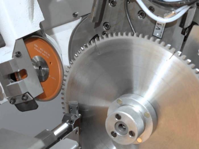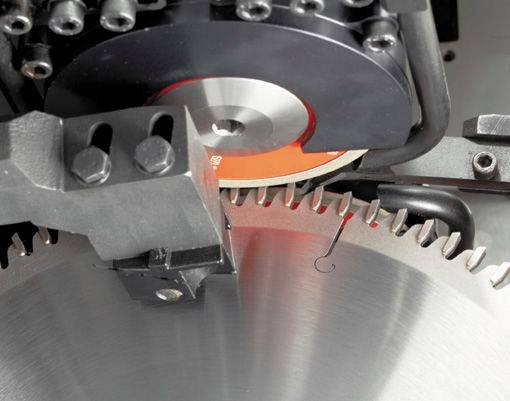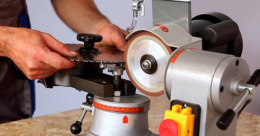 Применение специальных станков позволяет быстро и легко поточить циркулярную пилу. Главной задачей выступает контроль за углом подачи диска. Оператор выставляет его 1 раз, а затем перемещает зубья в область обработки, легко прижимая их плоскости к точильному кругу.