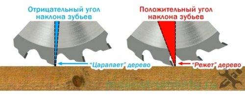 Передний угол может быть не только положительным, но и отрицательным. Пилы с таким углом используются для раскроя цветных металлов и пластмасс.
