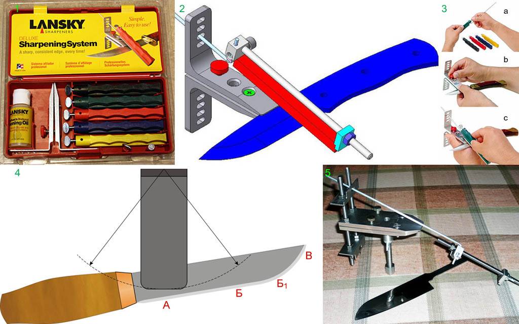 Не требует каких-либо особых навыков и пользование ручной точилкой для ножей типа Lansky-Metabo, поз. 1 на рис. Схема ее устройства дана на поз. 2, а порядок пользования – на поз. 3. Недостатком точилки Lansky-Metabo считается нестабильность угла заточки по длине лезвия: по нему ведут штангой с оселком. Вынос точки касания при этом непрерывно меняется, т.к. она описывает дугу окружности, а лезвие иной конфигурации. Соотв. «плавает» и угол. Поэтому точилку Lansky-Metabo используют преимущественно для заточки походных и охотничьих ножей со сравнительно коротким клинком.